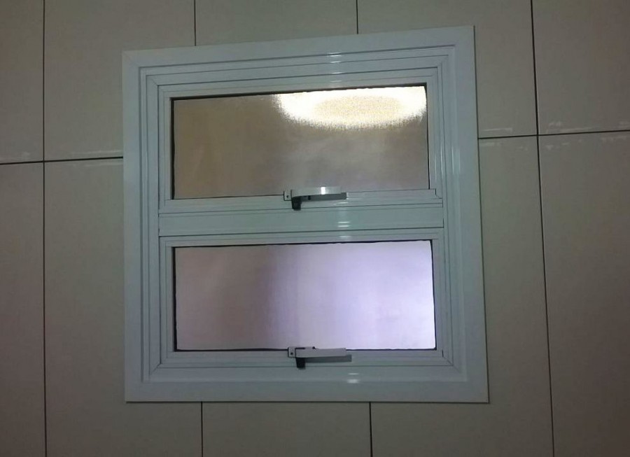 Janela de correr, 2 folhas móveis, basculante superior com vidro canelado.